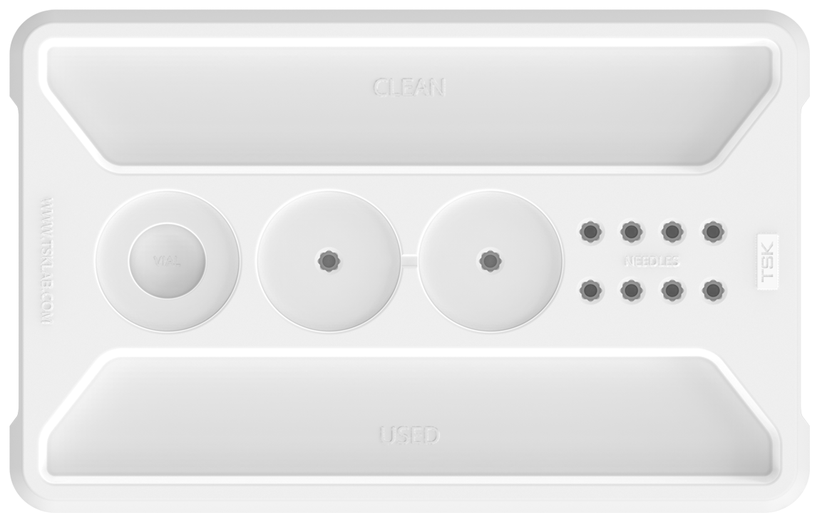 - die TSK-Behandlungsschale ist passend für alle TSK-Nadeln, TSK-Kanülen sowie alle größeren BoNT-Ampullen und Hautfüllerspritzen konzipiert