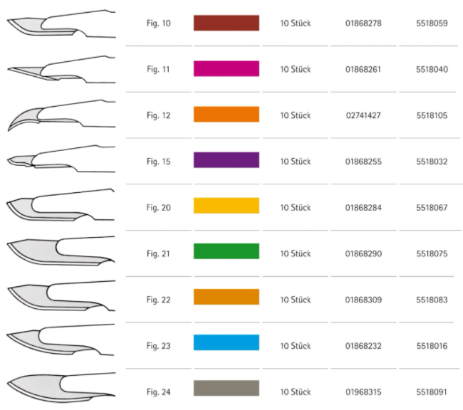- Nr. 10a: Ähnlich der 11-Klinge, aber nicht so spitz.